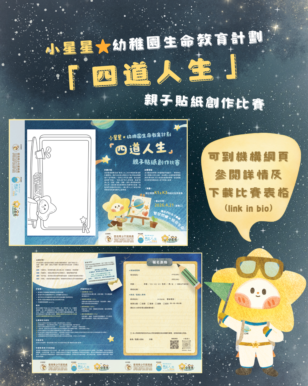 小星星-幼稚園生命教育計劃 文件下載: 四道人生親子貼紙創作比賽表格(PDF版) Instagram: https://www.instagram.com/littlestar_hkcys?igsh=MWwwNWRvczc0aHYwZg== 歡迎預約活動: 活動報名表連結:小星星—幼稚園生命教育計劃 26-27 (此報名表供學校/機構聯絡人使用) 聯絡方式: 如有任何查詢,歡迎致電 2366 2849 或電郵至 ppisw@hkcys.org.hk 與計劃主管陳穎芝姑娘(Vicky)聯絡。