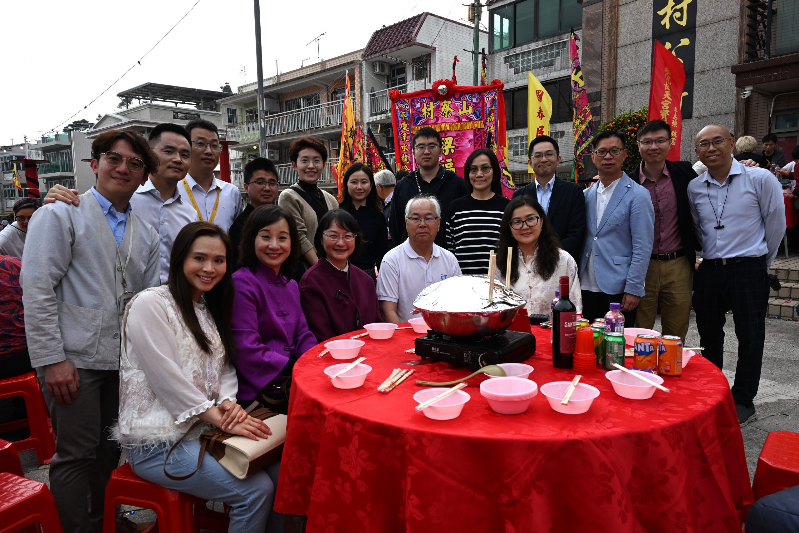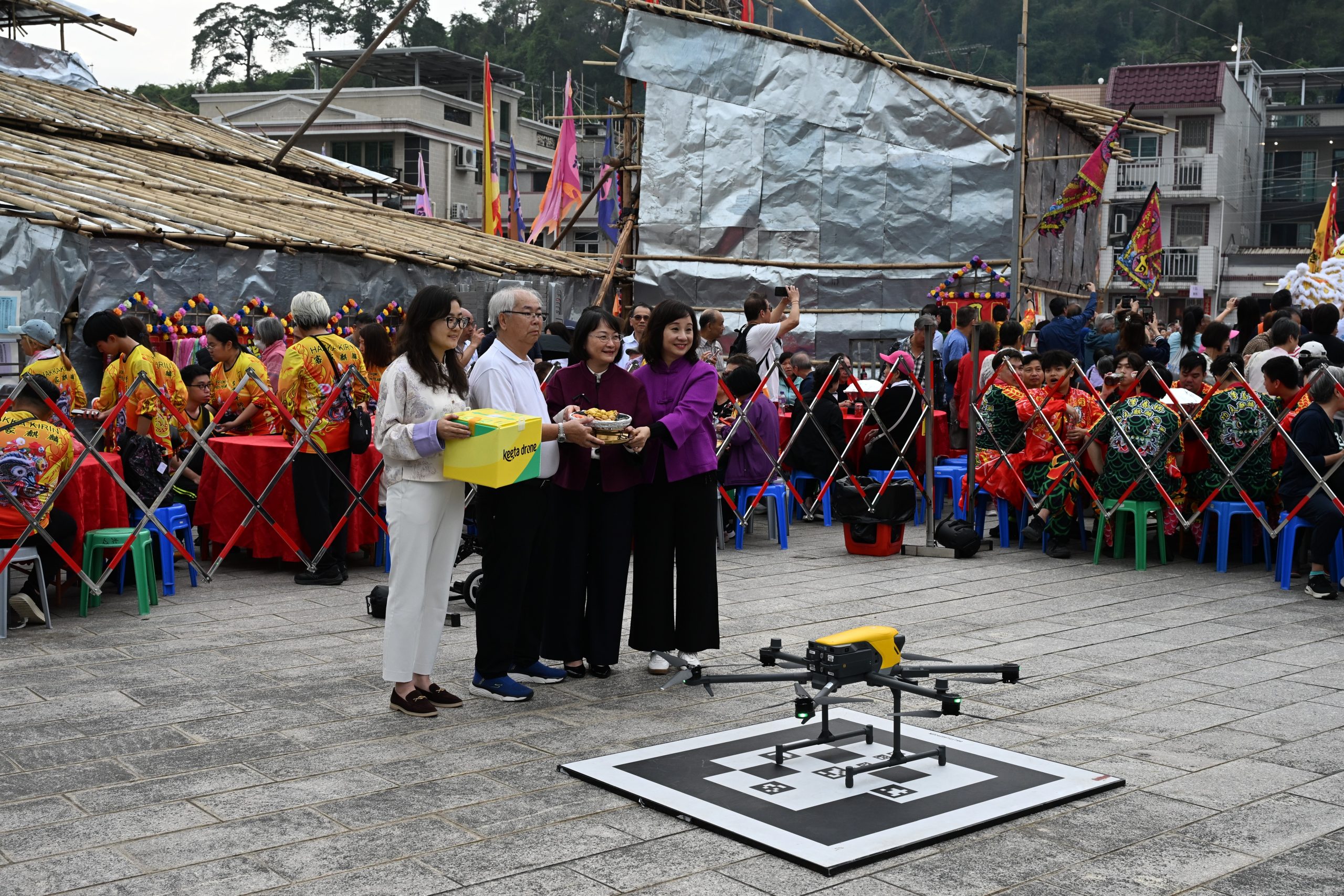 適逢2月27日大埔汀角村舉行協天宮寶誕暨新春團拜活動,安排無人機由科學園飛抵汀角村送上盆菜模型。 大埔社署福利專員馮曼瑜女士、香港青少年服務處總幹事李婉心女士及美團無人機業務公共事務負責人閆琰女士共同宣佈航線正式開通,汀角村村長李潤喜先生及逾千村民見證此創新一刻。標誌航線正式試行,逢星期一至五,由本處受訓的職員接收飯餐送到長者家中。