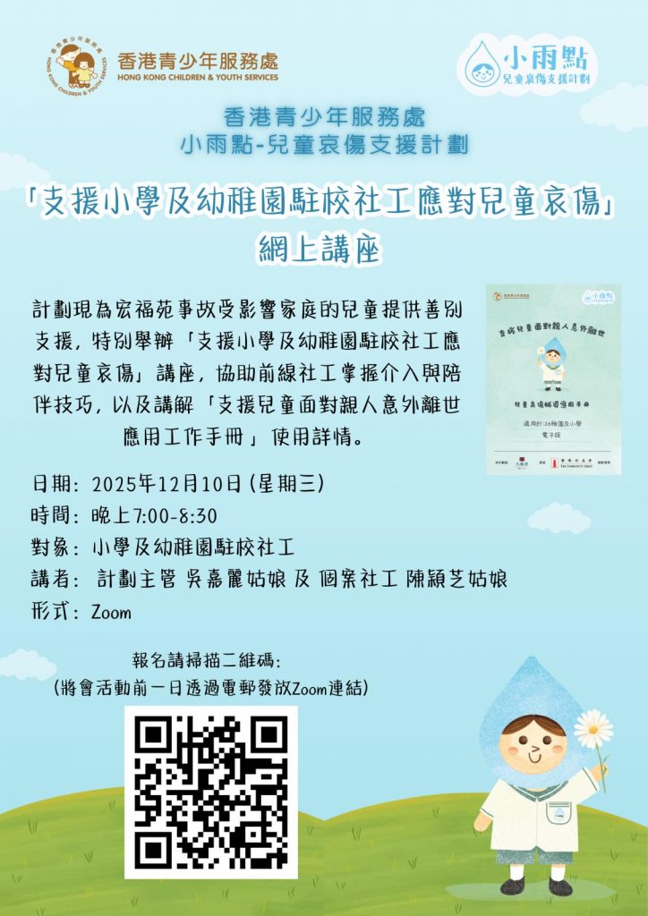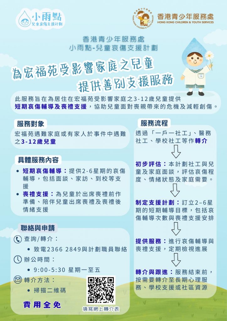 小雨點-兒童哀傷支援計劃 簡介: 兒童的漫漫成長路上遇到不少磨練和挑戰,「小雨點-兒童哀傷支援計劃」 希望幫助一群現正經歷失去親人的兒童,能夠透過計劃減少死亡帶來的情緒困擾和適應沒有逝世者的新生活。即使路縱崎嶇,「小雨點」提醒他們可以用雨水滋養自己,繼續在風雨中茁莊成長。 目標: 協助兒童面對因家人重病晚期、臨終或離世帶來的情緒困擾及經濟需要提升學校、家庭及助人專業團體對兒童哀傷輔導及生死教育的關注 對象: 3歲至12歲兒童及其家人對生死教育有興趣的學校及家庭關注喪親兒童的助人專業人士 地區: 全港 年期: 2024年1月至2025年12月(兩年) 特色: 以「及早識別、及早支援」為目標,支援面對家人離世而受情緒困擾之兒童及其家庭向受助家庭發放「兒童成長經濟援助 」推動以「兒童為本」的生死教育,學習正面看待生死議題 申請方法: 個案轉介者填妥「服務轉介表」,以傳真或電郵方式交回辦事處歡迎以電話或電郵方式查詢生死教育活動 文件下載: 服務轉介表 (PDF版)宣傳單張 (PDF版)「支援兒童面對親人意外離世–兒童哀傷輔導應用手冊」(PDF版) Instagram: https://www.instagram.com/raindrops_hkcys/ 本計劃由香港公益金資助,如有任何查詢,歡迎致電2366 2849或電郵至raindrops@hkcys.org.hk與社工吳嘉麗姑娘(Kelly) 或活動幹事張詠琪小姐(Alice) 聯絡。